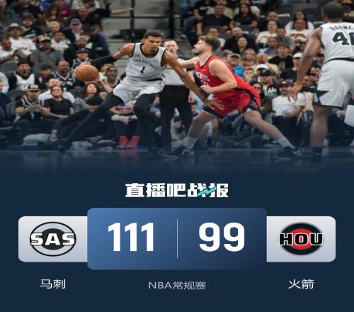 此役一上来双方短暂试探,申京单节11分发挥亮眼,杜兰特和阿门续上火力,中段马刺短暂回应,火箭再度发力确立优势,首节结束时火箭领先10分,次节回来,文班找到感觉率队追分,但火箭多点开花牢牢占优,半场战罢,火箭保持8分优势。短暂休整后马刺延续追分势头,末段一波9-0实现反超,阿门隔扣科内特率队稳住局势,三节结束后火箭守住2分领先,末节决战,火箭进攻再次断电,文班连拿7分率队轰出13-2攻击波,火箭未能及时复苏,最终马刺111-99力克对手。
